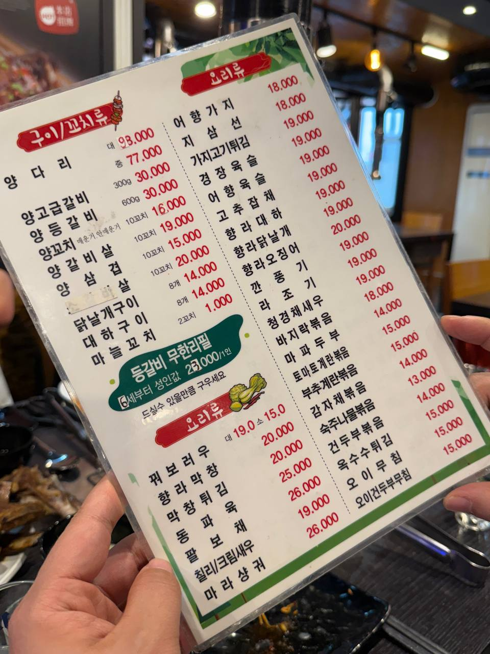 양갈비와 양꼬치 말고도 다양한 중국 음식이 있고, 양갈비 무한리필을 주문하면 서비스로 랜덤 메뉴 2개가 제공되는데
