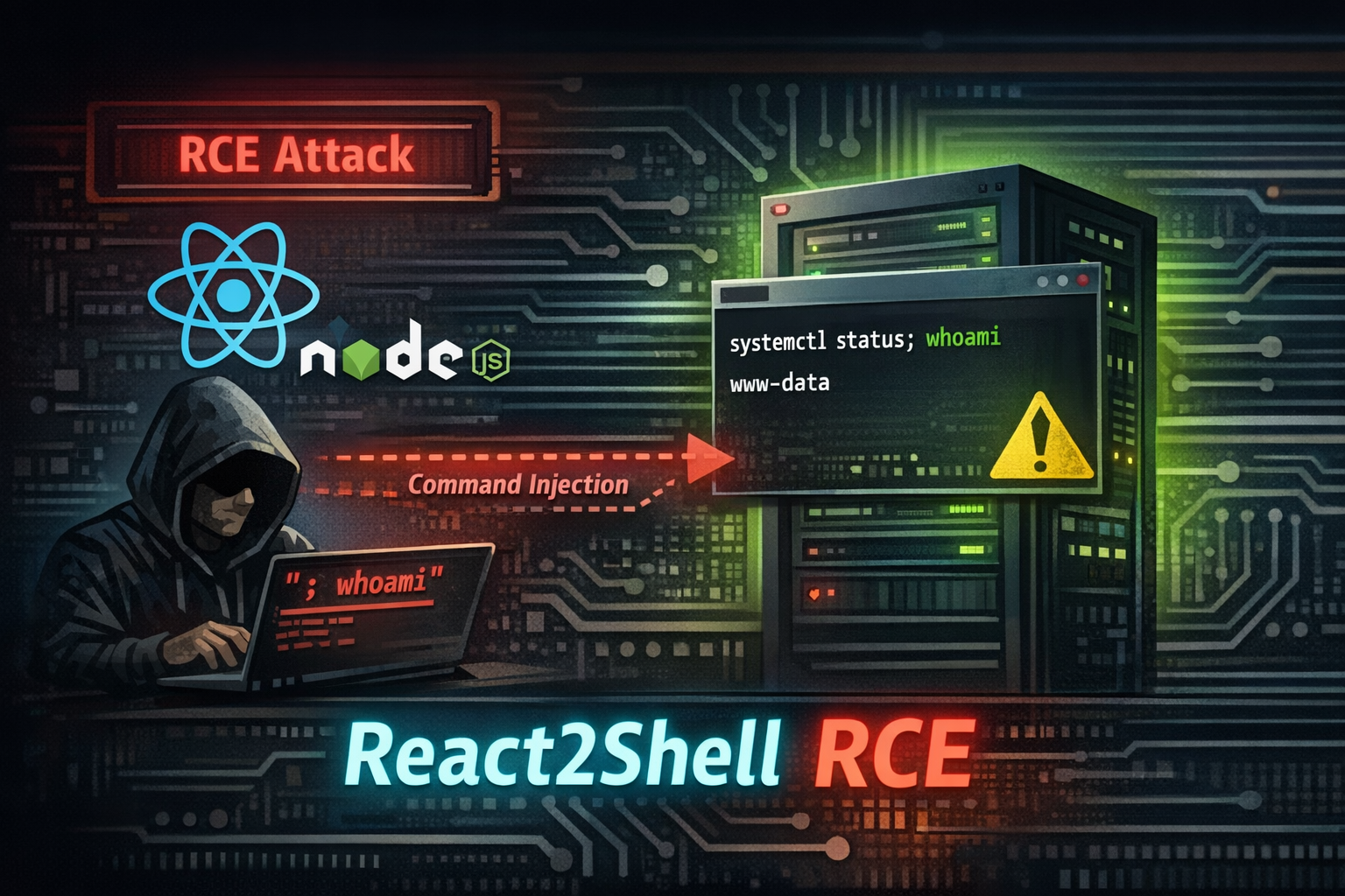 **React2Shell RCE(Remote Code Execution)**는 React 기반 웹 애플리케이션, 특히 Node.js 기반 SSR(Server-Side Rendering) 환경에서 사용자 입력값이 적절히 검증되지 않을 경우 서버에서 임의의 시스템…